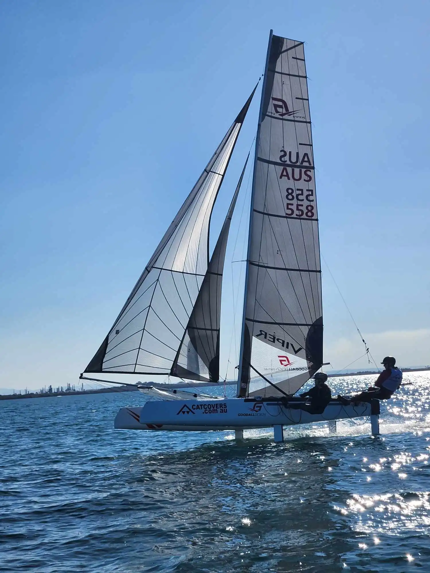 The foiling viper does not belong to a racing class so most training and racing was spent alongside local Olympic NACRA 17s. In July 2023 we experimented with a new sail design. The spinnaker was swapped out for a code zero akin to those found on larger catamarans like GC32 and ETF26. The theory behind it was to attempt to stabilise the foiling downwind in high wind conditions. By having a flat sail we can control precisely the pitch of the boat. Doing so, we sacrfice some depth and VMG in the hopes to gain a lot of speed. Testing was postponed in favour of prepration for upcoming world championships.